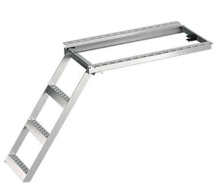 3-stufige Schiebeleiter zur Montage unter einem Aufbau oder einer Ladefläche. Einsetzbar in Fahrzeugaufbauten, Kofferanhängern, Pritschenanhängern, Tankwagen und Anhängern. Die Leiter hat rutschfeste Stufen und eine Anti-Rutsch-Sicherung.