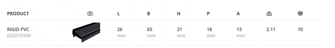 PVC/Gummi-Dichtung für Kühlhäuser L=26 mm, B=65 mm, H=21 mm, P=18 mm, A=15 mm
