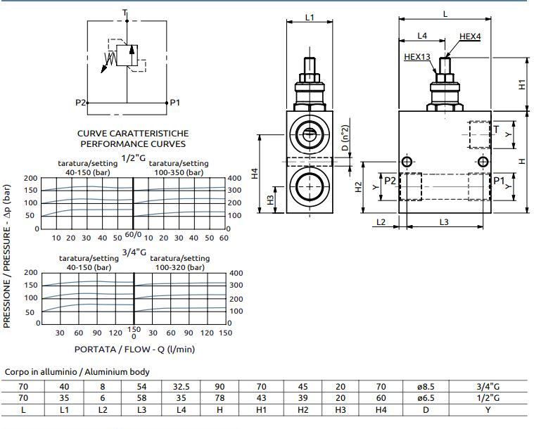 Compact aluminum relief valve mushroom type design, for overload protection. Two setting ranges available.