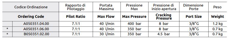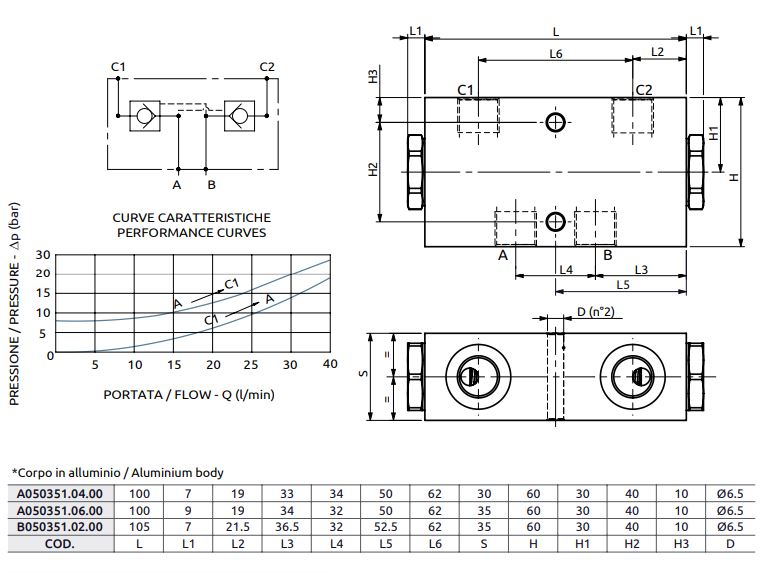 The valve allows free flow from A to C1 and from B to C2, while in opposite directions the flow is controlled. Suitable for holding the load, but not for controlling the lowering of the load. *- aluminum