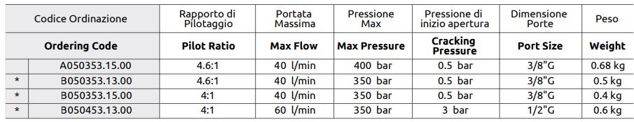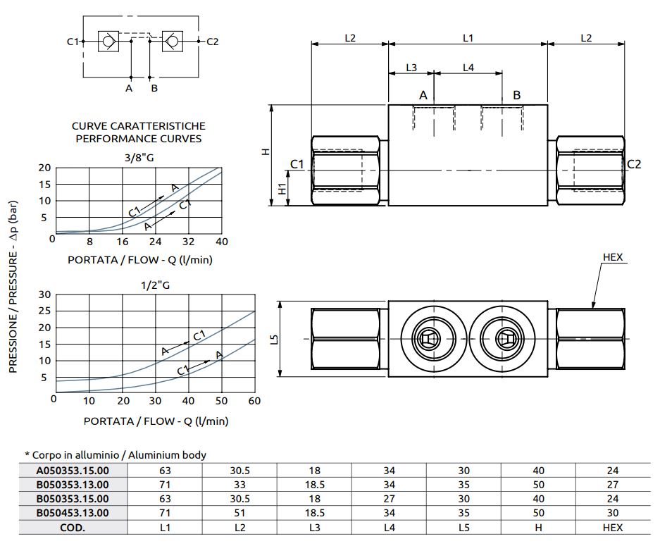 The valve allows free flow from A to C1 and from B to C2, while in opposite directions the flow is controlled. Suitable for holding the load, but not for controlling the lowering of the load. *- aluminum version