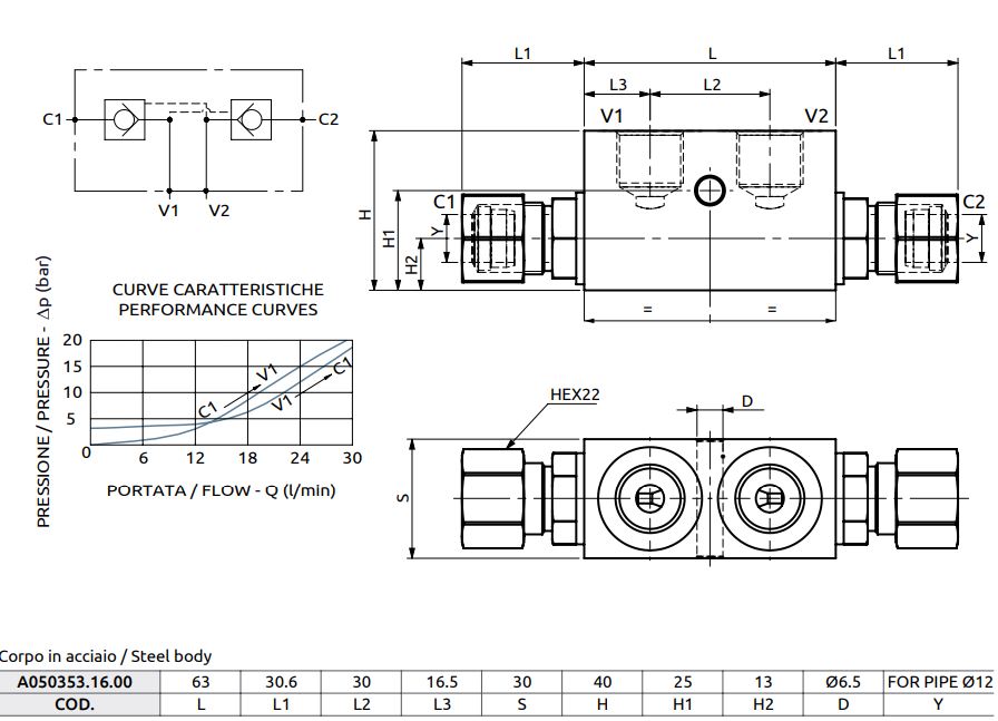 The valve allows free flow from A to C1 and from B to C2, while in opposite directions the flow is controlled. Suitable for holding the load, but not for controlling the lowering of the load.
