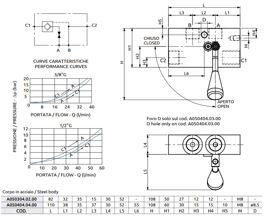 The valve allows free flow from A to C1. Suitable for holding the load, but not for controlling the lowering of the load.