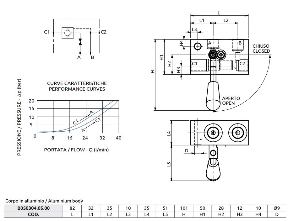 The valve allows free flow from A to C1. Suitable for holding the load, but not for controlling the lowering of the load.
