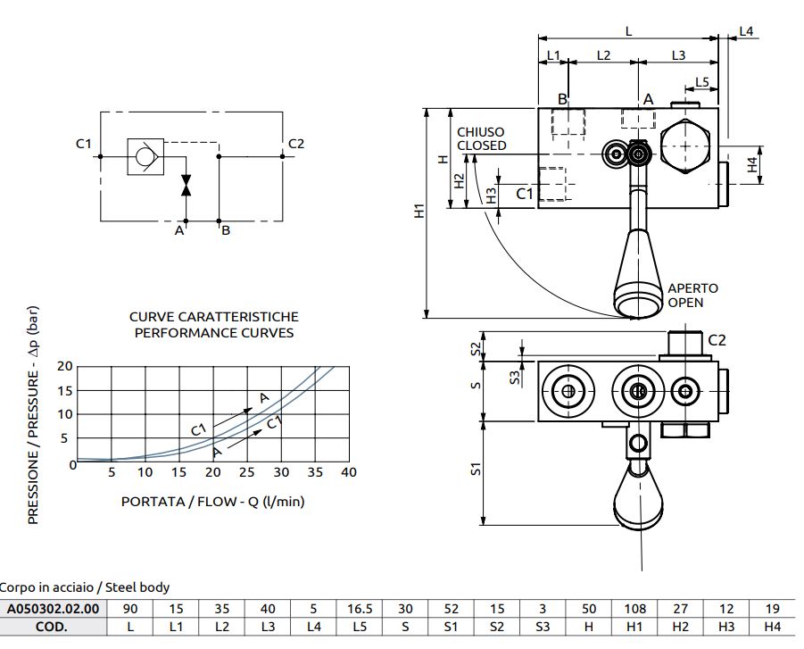 The valve allows free flow from A to C1. Suitable for holding the load, but not for controlling the lowering of the load.