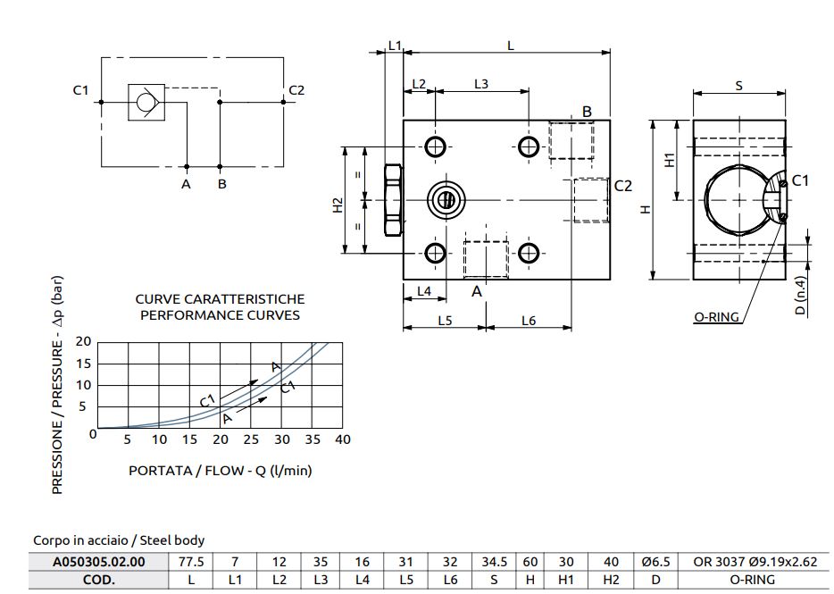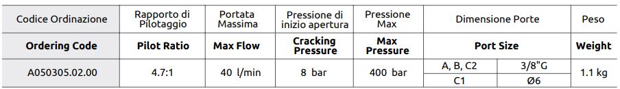 The valve allows free flow from A to C1. Suitable for holding the load, but not for controlling the lowering of the load.
