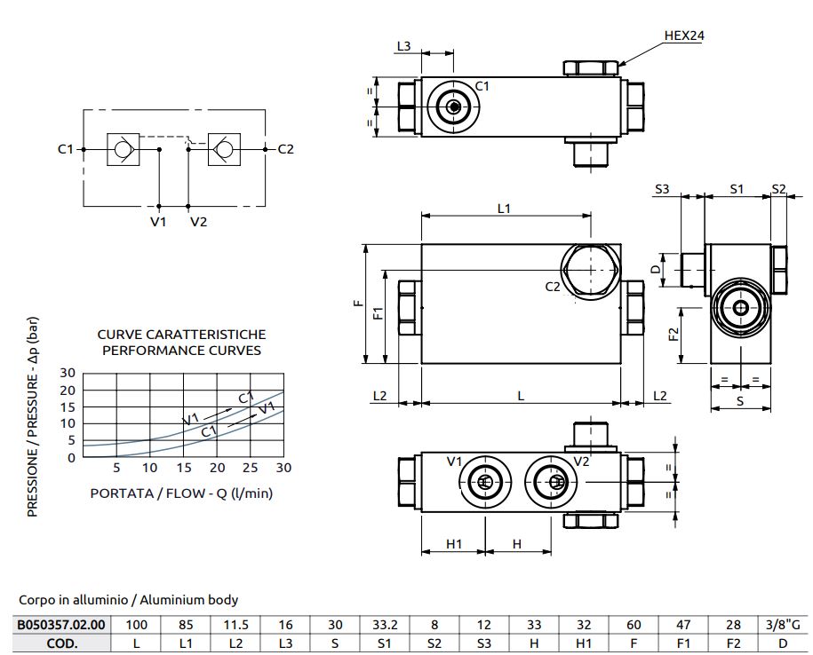 The valve allows free flow from A to C1. Suitable for load holding, but not for load lowering control.