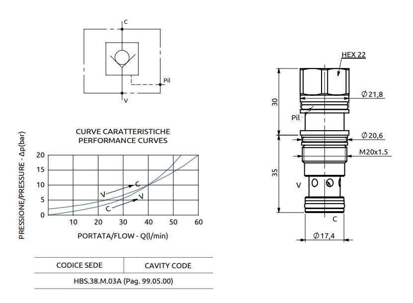 The valve allows free flow from V to C. Suitable for load holding, but not for lowering control.