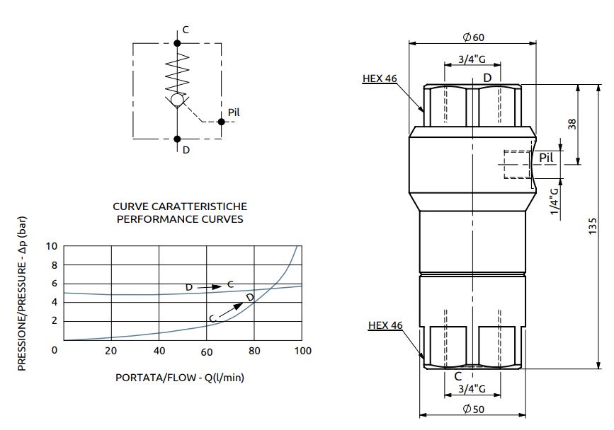 The valve allows free flow from V to C. Suitable for load holding, but not for lowering control.