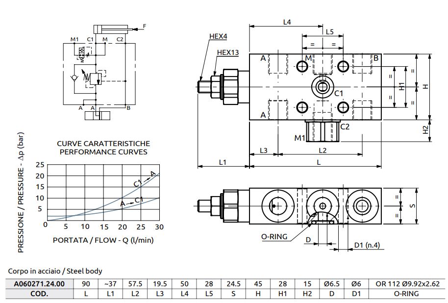 Single-acting balancing valve, recommended for hydraulic Directional Valvey with spools with open center in neutral position. Connect to the system as shown in the diagram. The valve allows free flow from A to C1, load support from hydraulic Directional Valve in the neutral position or when the pump is stopped, control downward movement of the load, protect against overpressure in the cylinder.