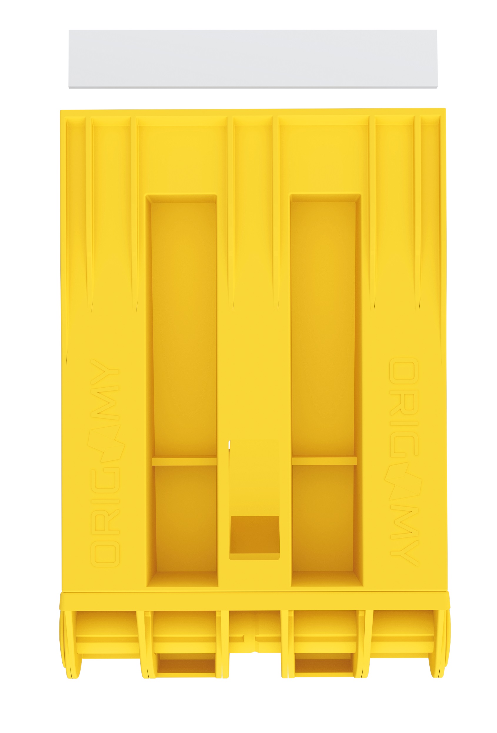 Klin pod koła składany ORIGAMY E36 żółty z blachą wykonany z termoplastiku, homologowany, do aut osobowych, przyczepek samochodowych i aut dostawczych.