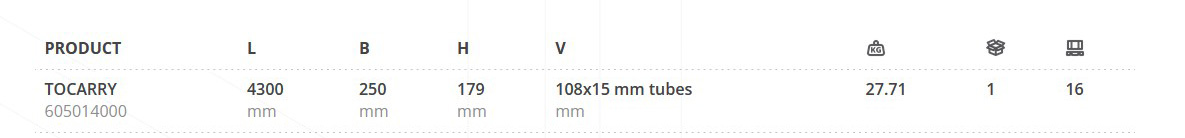 - Tuba transportowa TOCARRY L=4300, B=250, H=179, V=108x15 mm