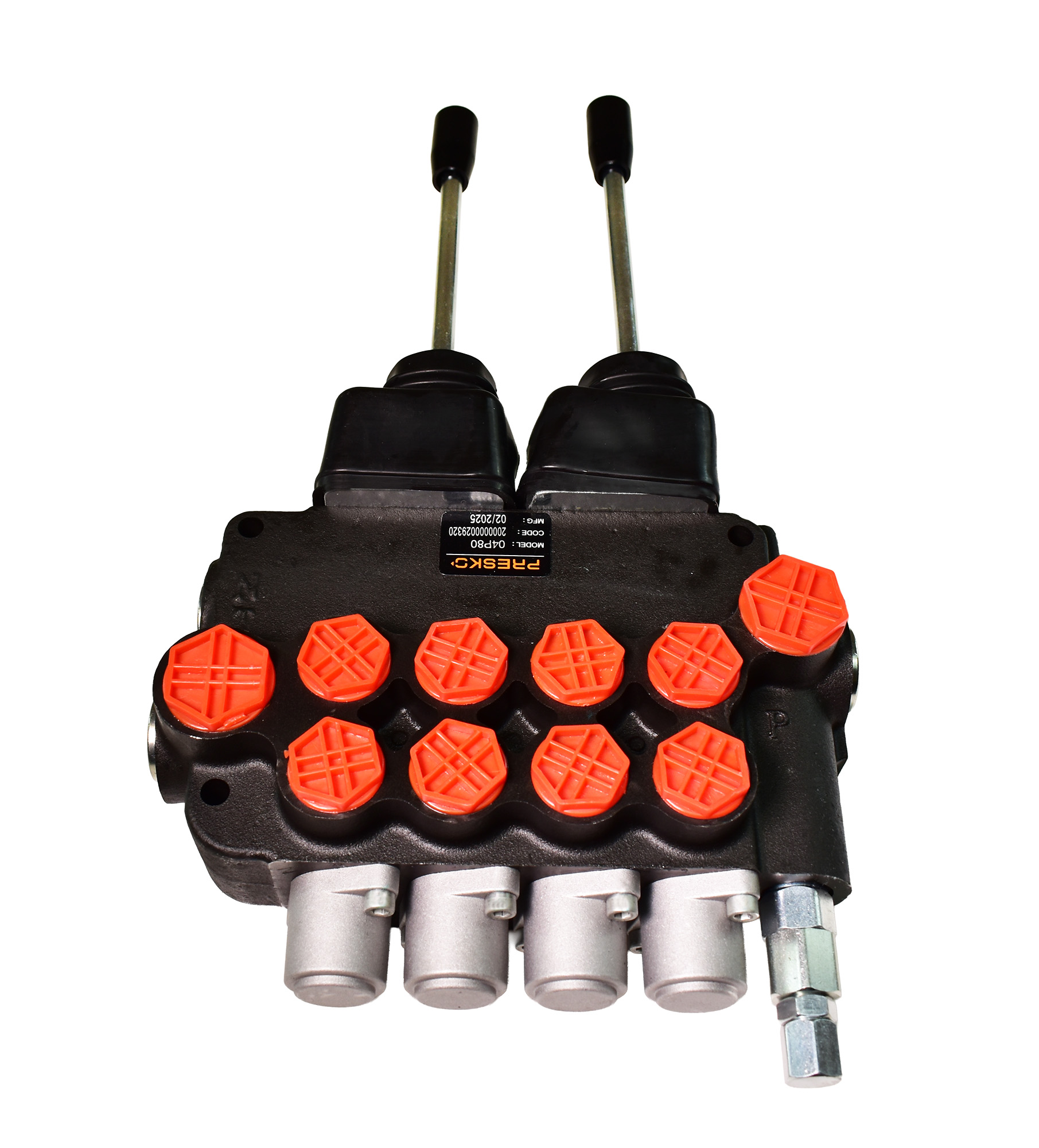 | Opis funkcji - Ten zaawansowany rozdzielacz hydrauliczny Presko został zaprojektowany, aby zapewnić precyzyjne i efektywne sterowanie czterema niezależnymi funkcjami hydraulicznymi w Twojej maszynie.- Dwie pierwsze i dwie ostatnie sekcje (sterowane joystickiem na sprężynie): Joystick umożliwia intuicyjne i skoordynowane sterowanie dwoma sekcjami jednocześnie. Posiada 4 pozycje robocze, co pozwala na płynne i precyzyjne manewrowanie dwoma różnymi funkcjami (np. ruchy góra/dół i wychylenia na boki). Podobnie jak dźwignia, joystick automatycznie powraca do pozycji neutralnej po zwolnieniu, co zwiększa bezpieczeństwo i komfort użytkowania. To rozwiązanie jest szczególnie przydatne w aplikacjach wymagających precyzyjnej kontroli nad kilkoma ruchami, minimalizując zmęczenie operatora.