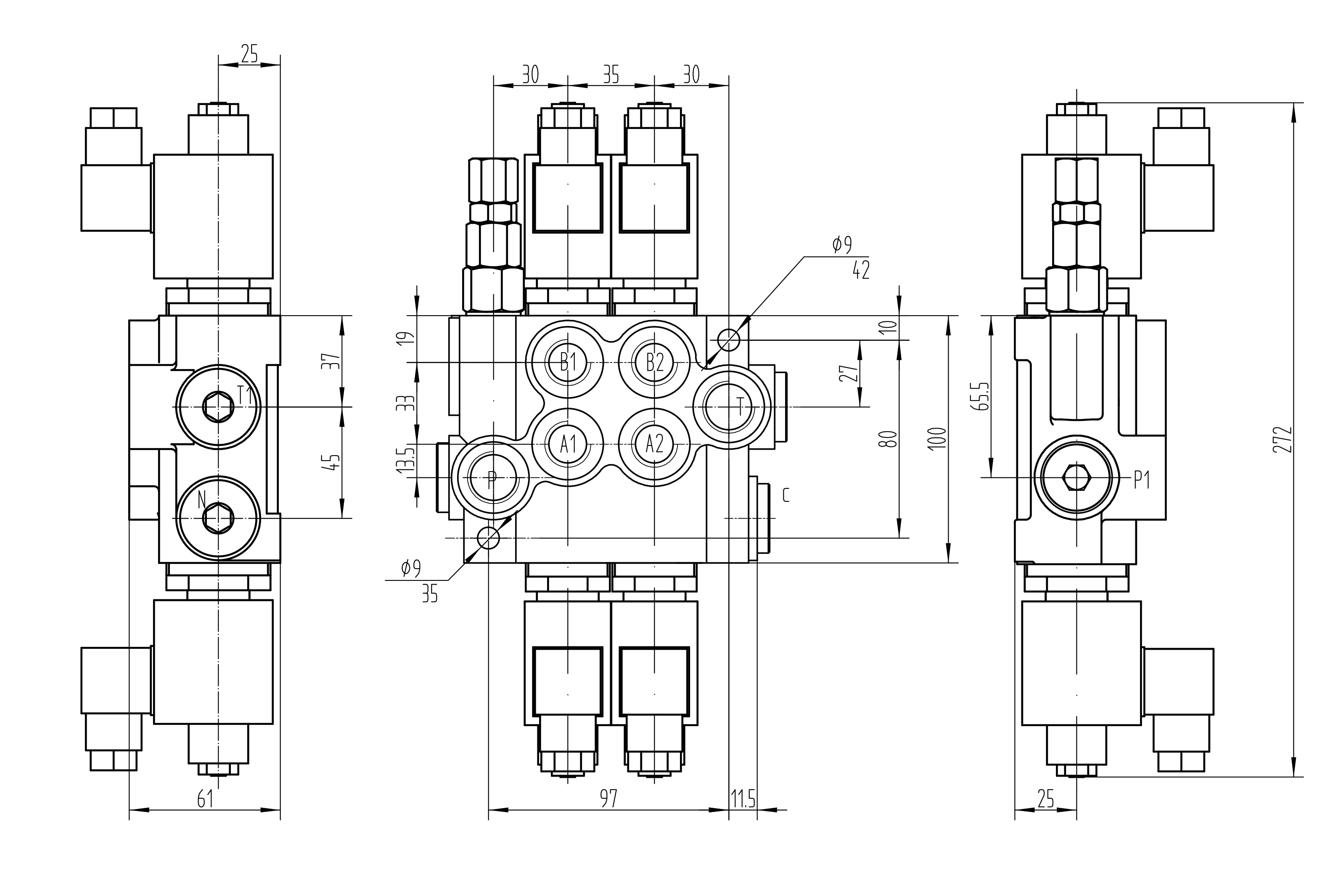 Rozdzielacz hydrauliczny dwusekcyjny sterowany elektrycznie 12V, o przepływie do 40l/min marki PRESKO