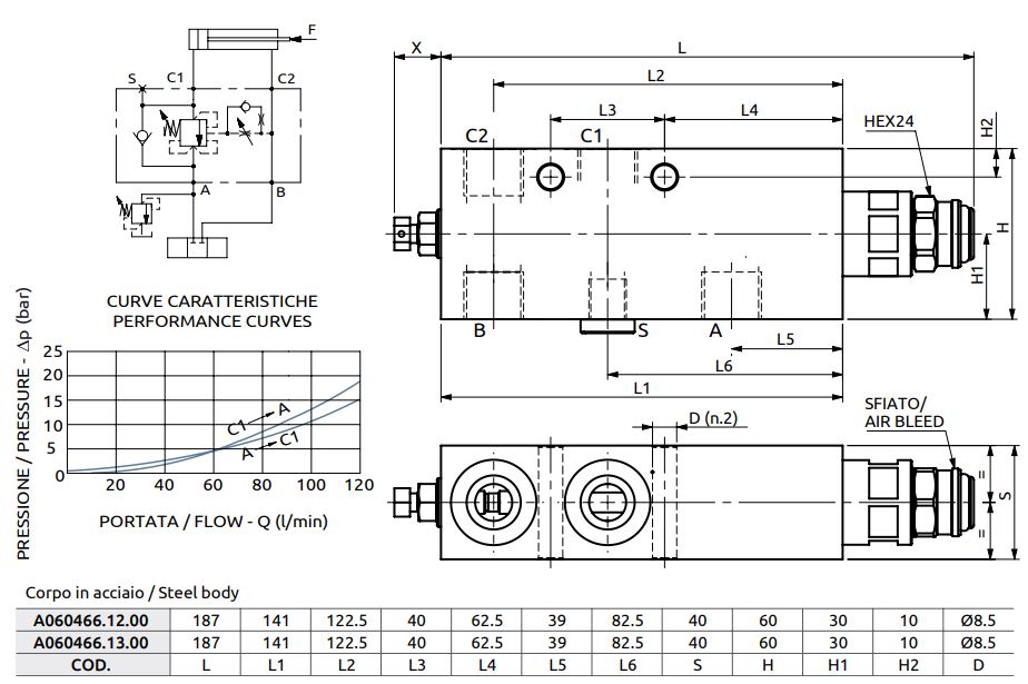 Pojedynczy zawór przelotowy, sugerowany do użytku z zamkniętymi środkowymi suwakami w neutralnej pozycji. Zawór umożliwia swobodny przepływ z A do C1, utrzymanie pozycji obciążenia z suwakiem w pozycji neutralnej lub gdy pompa nie pracuje.